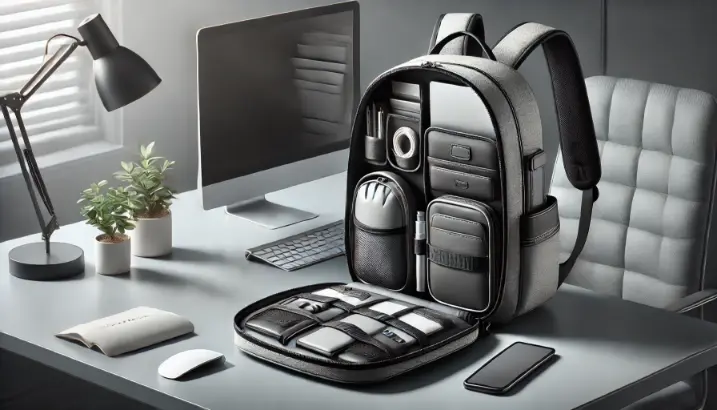 仕事道具としては、ノートパソコンやタブレット、充電器、必要な書類を忘れずに持参します。これらは専用のポケットに収納すると、リュックの中で散らばらずに済みます。特に充電器は、取り出しやすい場所に入れておくと便利です。